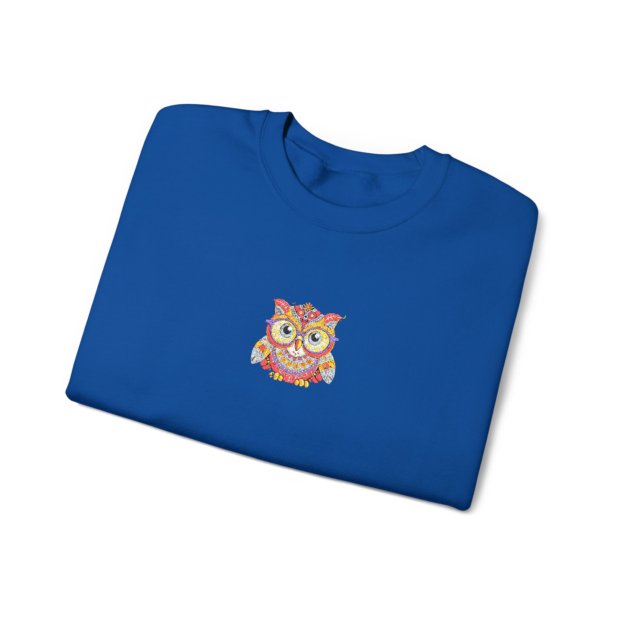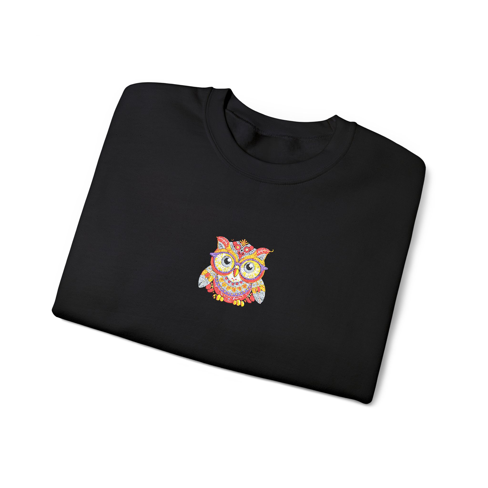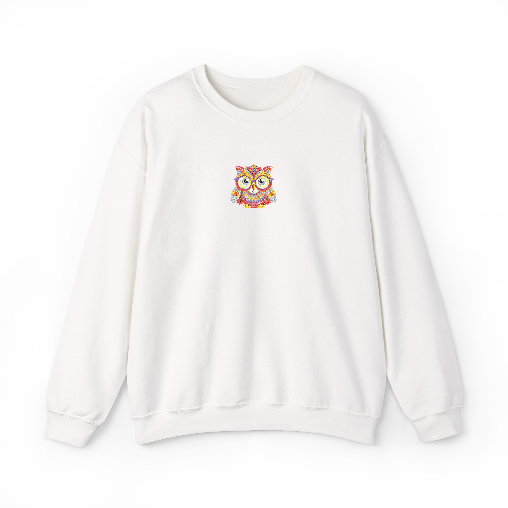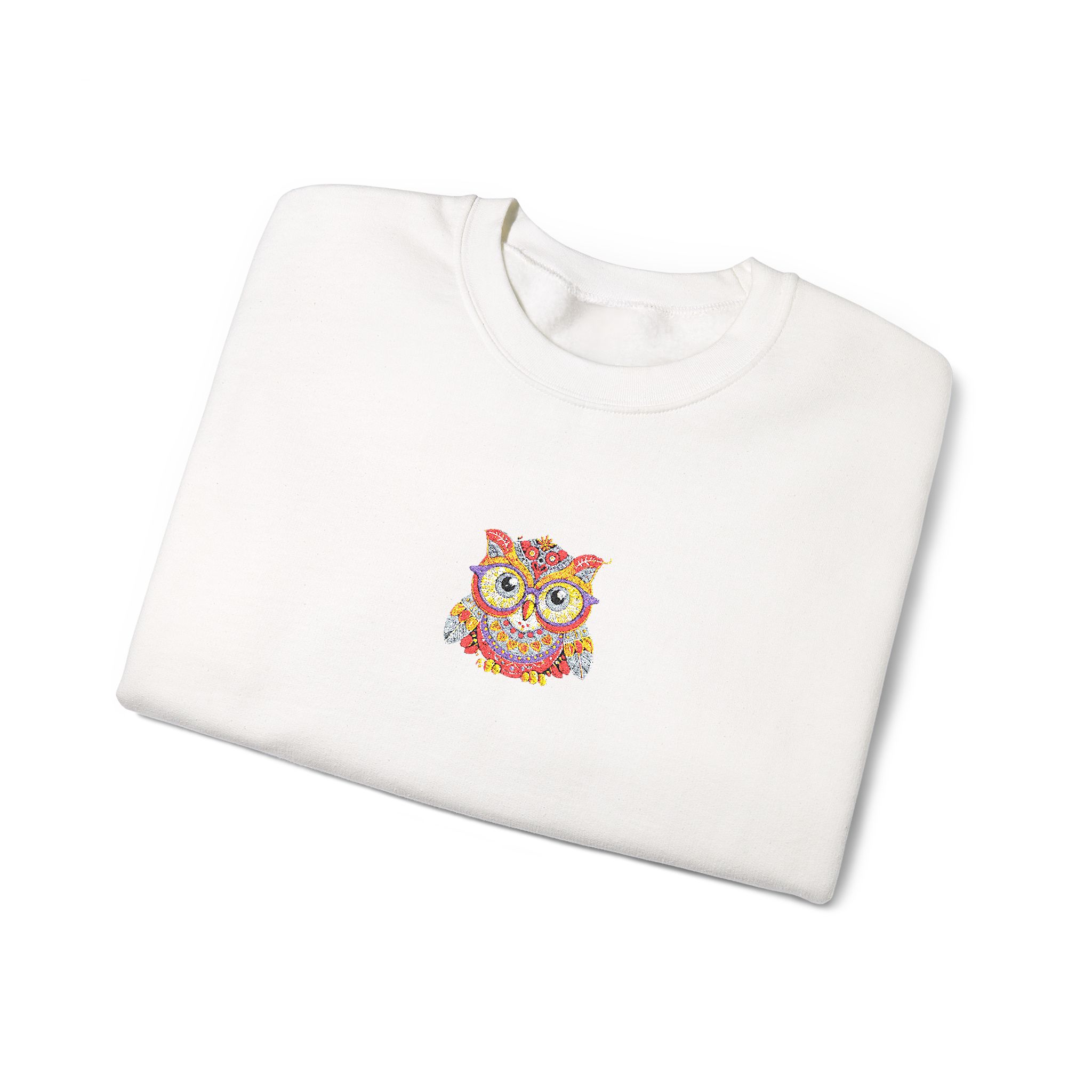 This cozy crewneck brings quiet comfort and a flash of personality. Soft, medium-weight fleece holds its shape while the embroidered colorful owl at the chest adds a hand-stitched, artful touch. It layers easily over tees or loungewear and becomes that go-to sweatshirt for cool mornings, late-night walks, or relaxed weekends at home. The clean white backdrop keeps the look fresh and wearable, while durable double-needle stitching and a ribbed collar mean it will stand up to frequent wear and washes.